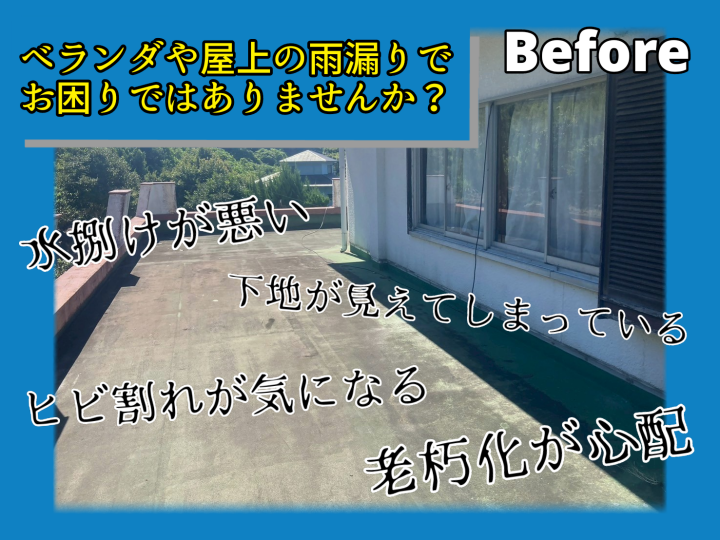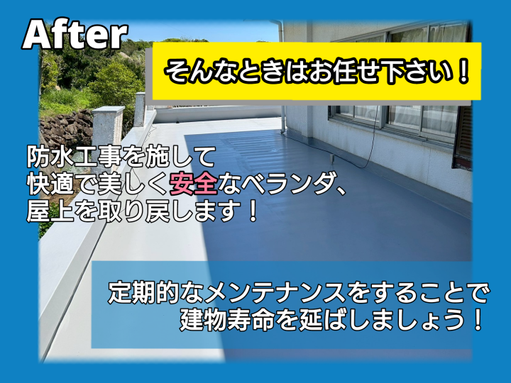 屋上やベランダは空に面してる分、過酷な天候に晒される部分になります。その為劣化が著しく定期的なメンテナンス等も必要になってきます。サッシ周りや防水層の劣化による雨水の侵入により建物の寿命を大きく損なう可能性があります。